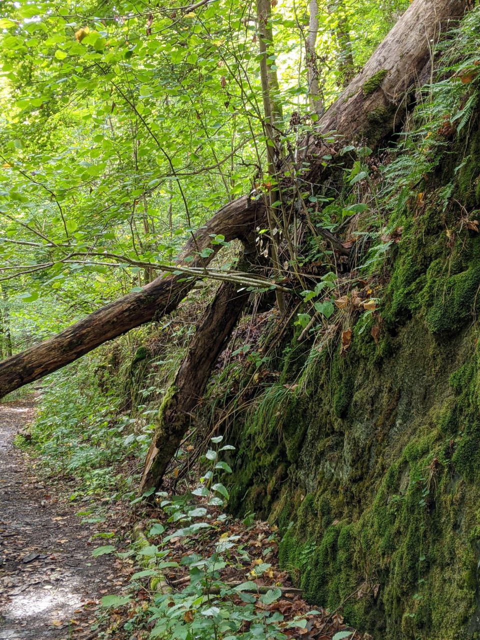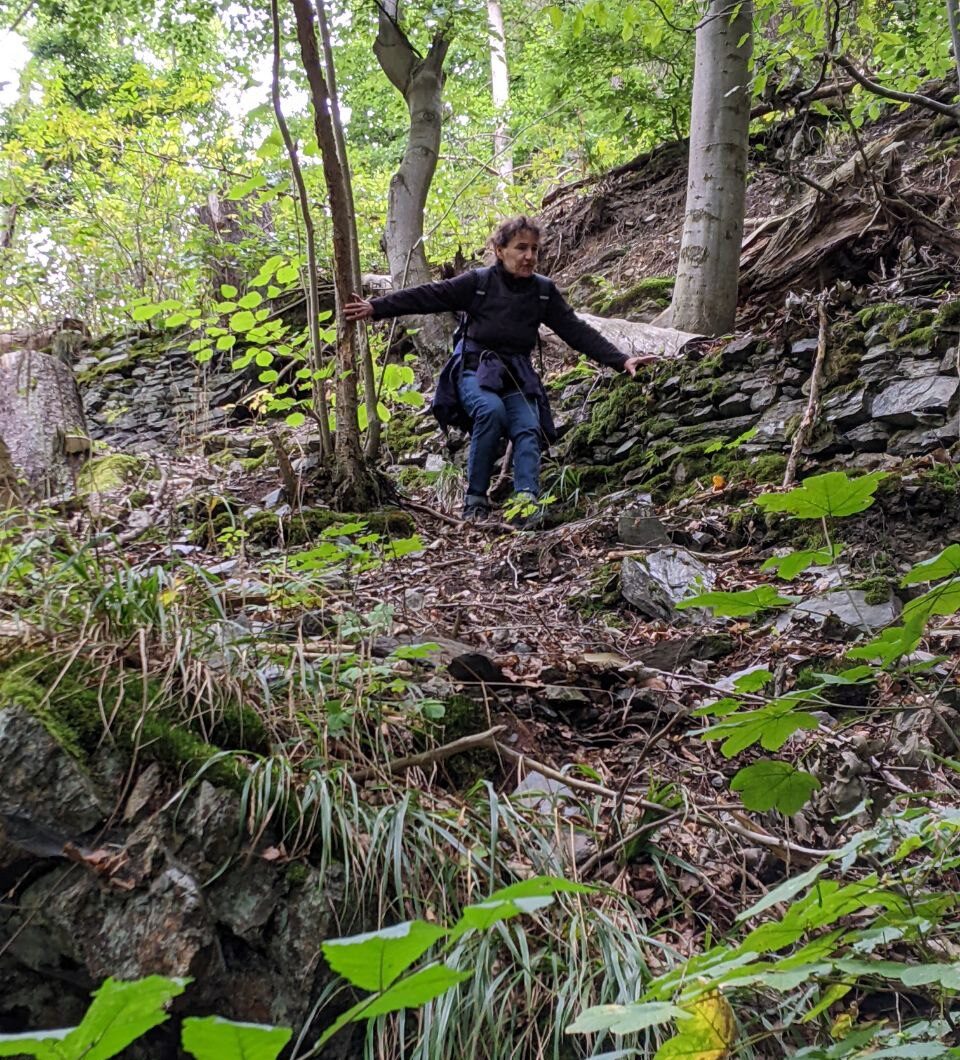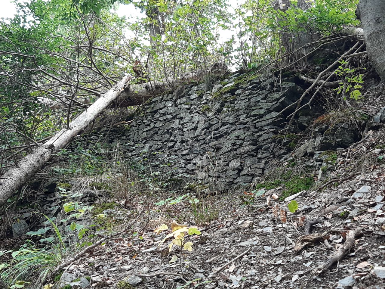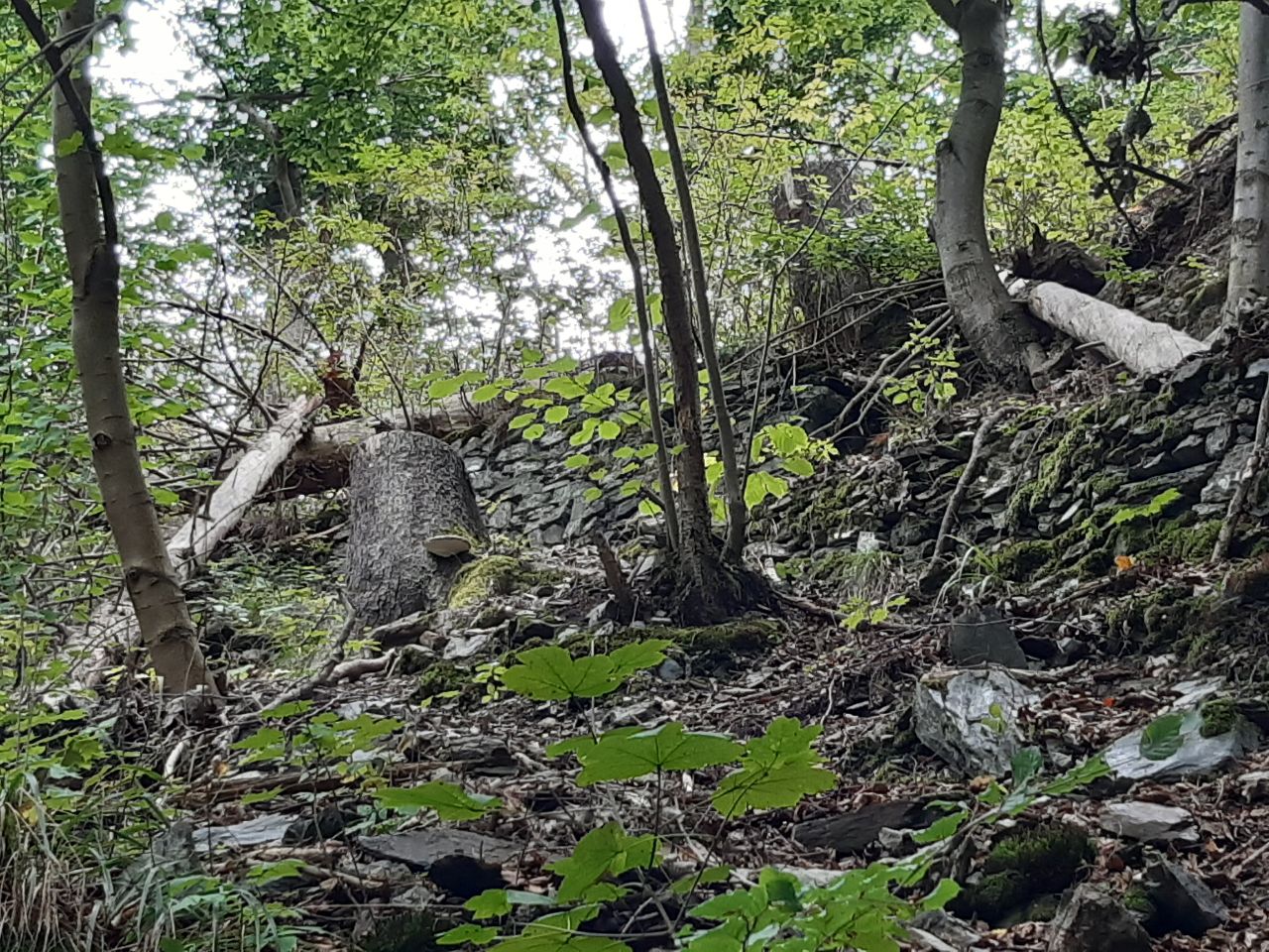 Die Mauer ist sehr sorgfältig aus flachen Schiefersteinen geschichtet. Es wirkt, als gibt es ältere und neuere Mauerabschnitte. Im Laufe der Zeit sind Teile sehr verwittert bzw. weggebrochen. Dahinter bzw. darüber ist nichts außer Wald. Ob das der Rest eines alten Bauwerkes bzw. eines ehemals bebauten Areals ist? Sehr rätselhaft!
