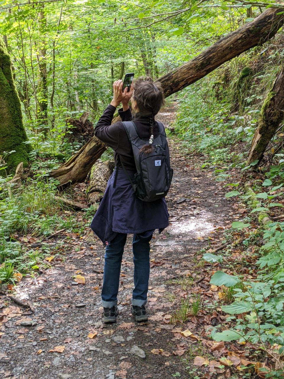 Wir laufen auf dem Hexenstieg durch das wilde Bodetal. Ich habe den Eindruck, daß es von Besuch zu Besuch immer wilder wird. Ich weiß nicht, ob man mit dem Aufräumen nicht hinterherkommt oder es mit Absicht sich selbst überlassen bleibt – jedenfalls ist es urwüchsig und wildromantisch. Es gibt Photomotive ohne Ende, und das Wandern geht nur langsam voran, weil das Auge schweift und sich nicht sattsehen kann!