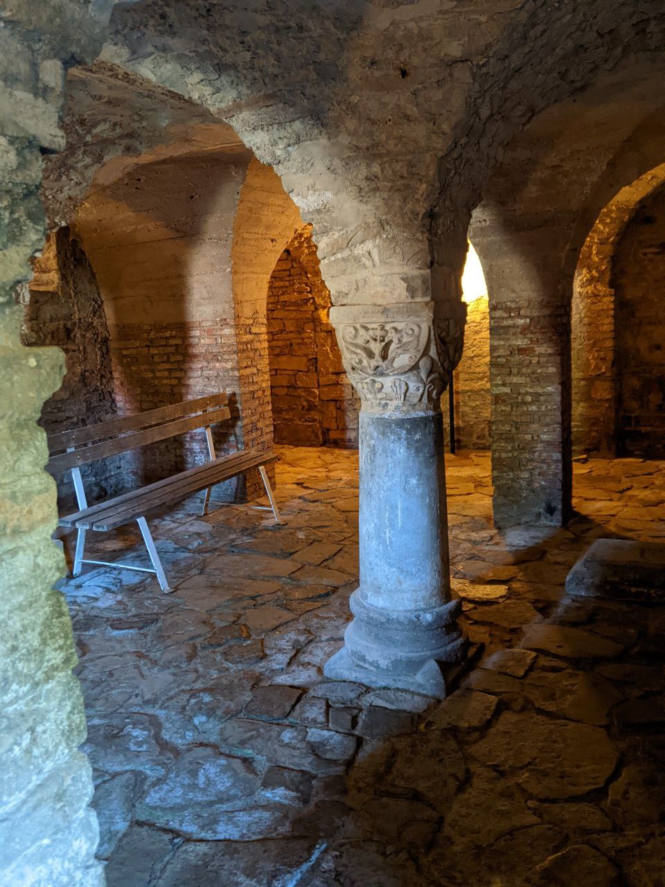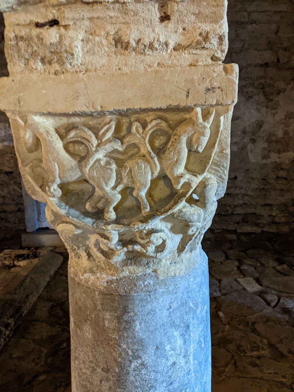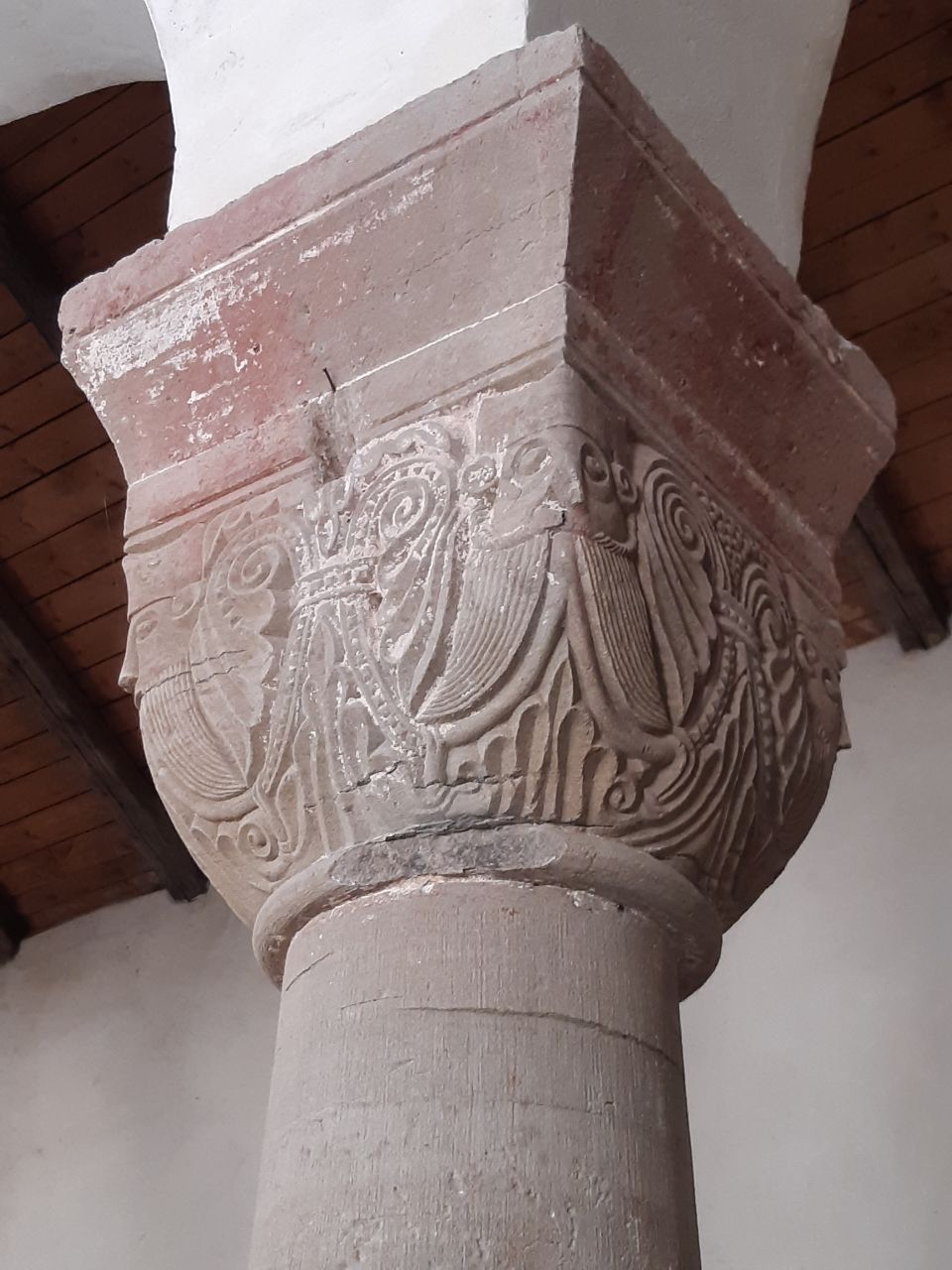 - altes Kapitell, toll die ausgeprägte Ornamentik in Spiralenform unten an der Kämpferplatte