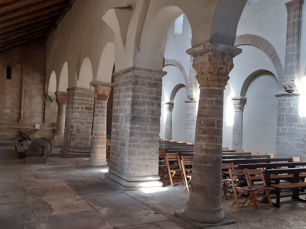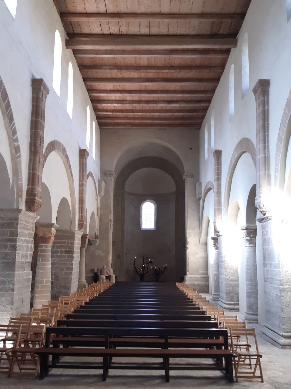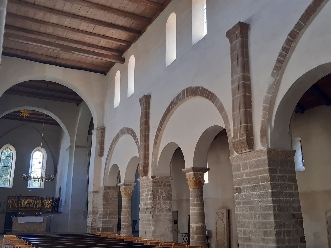 - Blick ins südliche Seitenschiff, an der Wand wurden im 12. Jh. Wandvorlagen für die Einwölbung des Mittelschiffes angebracht