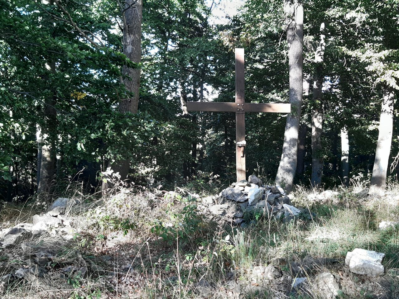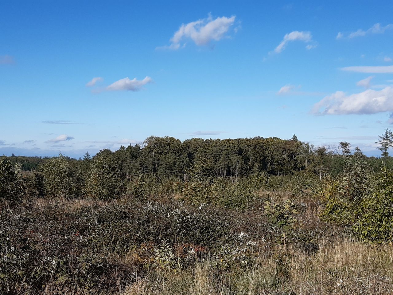 Mit einer eher vagen Wegbeschreibung zogen wir los in den Wald in der Nähe von Elbingerode. Wir liefen über ein gerodetes, jetzt eher niedrig bewachsenes Hochplateau in der Hoffnung, auf dem richtigen Weg zu sein. Dann tauchte wie eine Insel im Buschwerk in der Ferne das Wäldchen auf (siehe Photo), und intuitiv dachte ich – dort muß es sein. Was auf dem Photo nicht zu sehen ist, zwischen uns und dem Wäldchen liegt ein tiefes, steil eingeschnittenes Tal. Das Wäldchen ist nur von rechts aus südlicher Richtung begehbar und liegt auf einem Felsensporn, der auf allen anderen Seiten von tiefen Felseinschnitten umgeben ist.