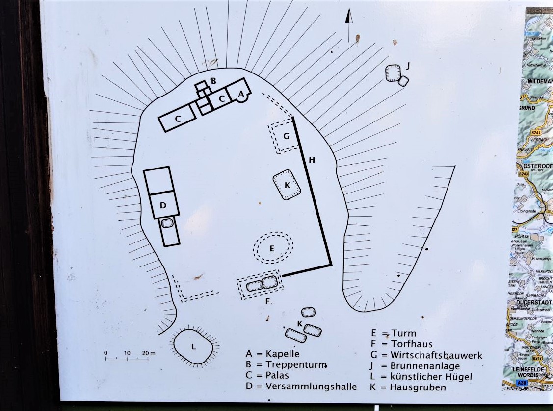 1885 wurden hier Ausgrabungen durchgeführt und die Lage von Gebäuden festgestellt. Erst in heutiger Zeit ist man jedoch sicher, hier die Pfalz Bodfeld zu sehen. Die Umrisse der Bauten werden durch Steinschüttungen nachgebildet. Vielleicht ist das eine oder andere Fundamentfragment noch zu sehen. An der Stelle, wo die ehemalige Burgkapelle vermutet wird, steht heute ein Holzkreuz.