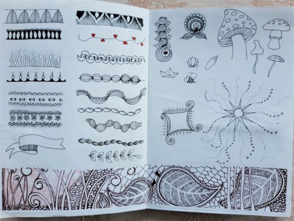 Seite im Skizzenbuch mit gesammelten Ideen für Borten und Ornamente