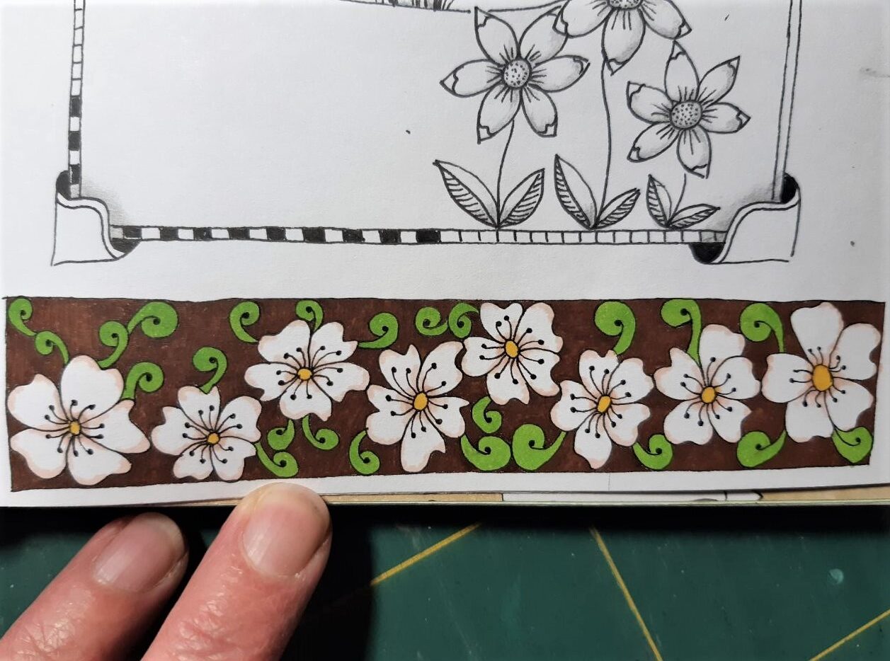 6. Du kannst im Skizzenbuch auch eine ganz kleine freie Ecke ausfüllen. Male Dir einfach einen Rahmen auf einer Seite, auf der noch etwas Platz ist, und fülle ihn spontan aus. Dadurch wird Dein Skizzenbuch beim Durchblättern schön bunt und abwechslungsreich. Gerade bei Büchern mit hochwertigeren Papieren lohnt es sich wirklich, den Platz auch auszunutzen.