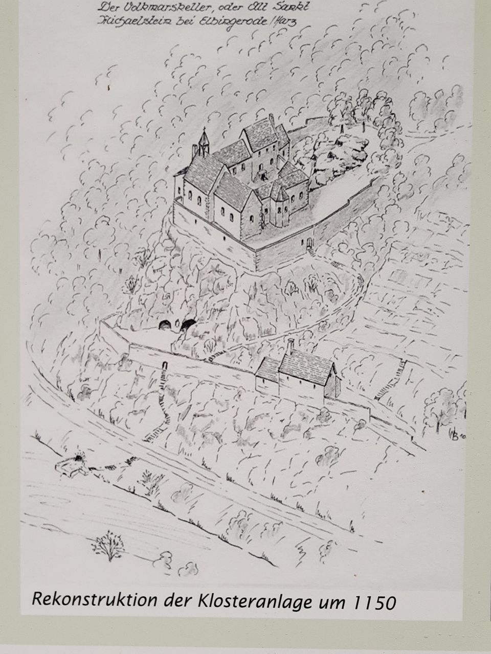 Aber 1176 wird schon als das Jahr genannt, in dem das neue Kloster Michaelstein bezogen wurde. Eine Kapelle dort oben soll noch bis ins Mittelalter benutzt worden sein. Auf der Rekonstruktionszeichnung ist gut zu erkennen, daß sich direkt unter dem Klosterbau die Höhlenzugänge befanden. Auch vom Innenhof oben ging ein Schacht runter zur Höhle (siehe Photo).